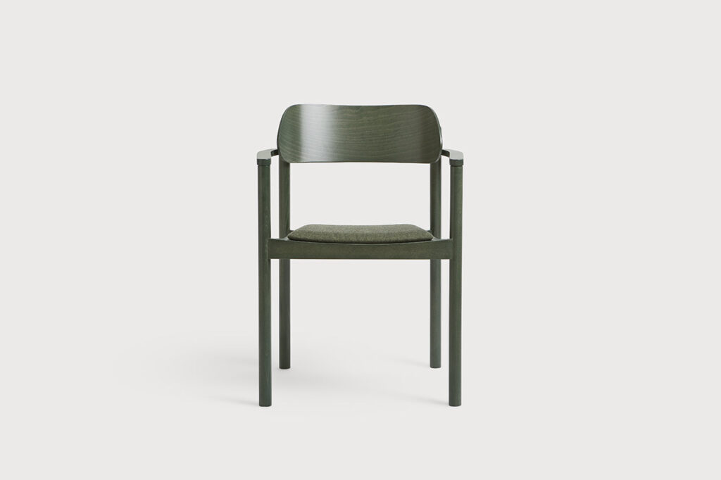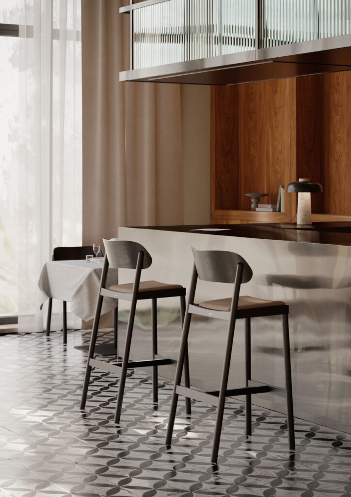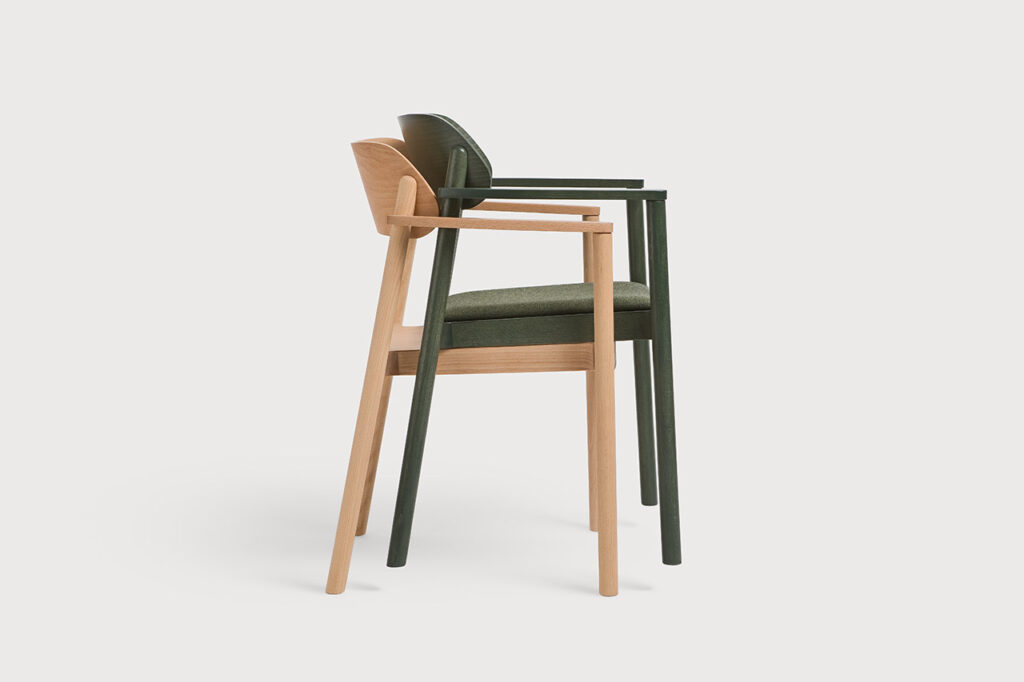 Kollektionen innehåller två stolsvarianter – med eller utan armstöd – samt barstolar i två höjder.