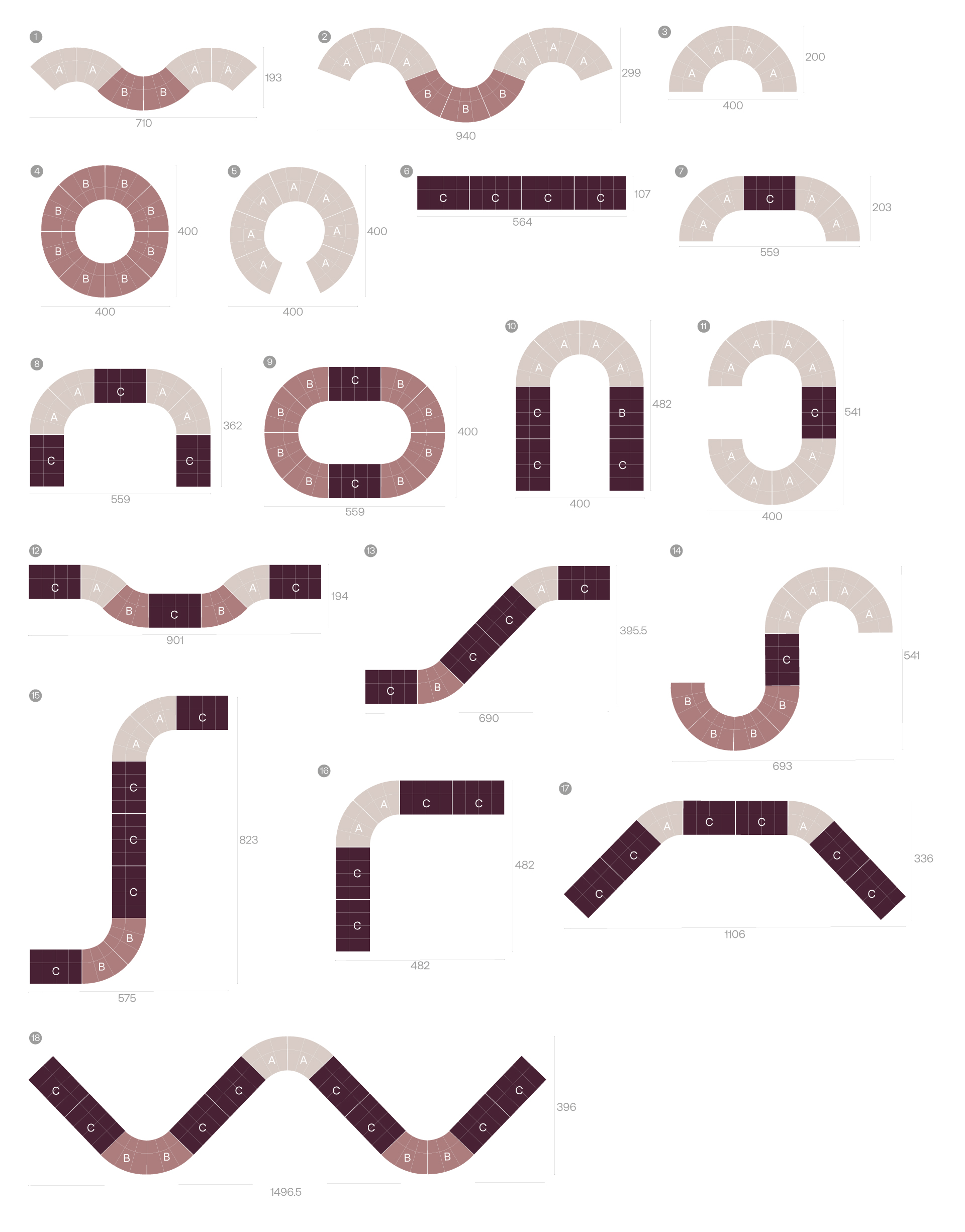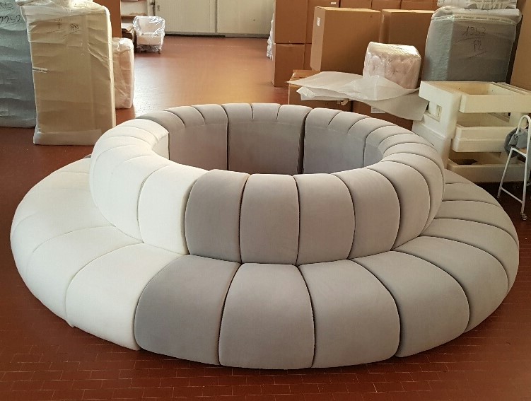 Modul B: yttre standardkurva 155cm. Modellen kräver elastiska tyger, nedan några av fabrikens val. Användning av kundens eget tyg på denna modell kräver en komplex teknisk justering. Ett prov på 15×15 cm måste godkännas i förväg av vår tekniska avdelning. Pris i COM mot förfrågan.