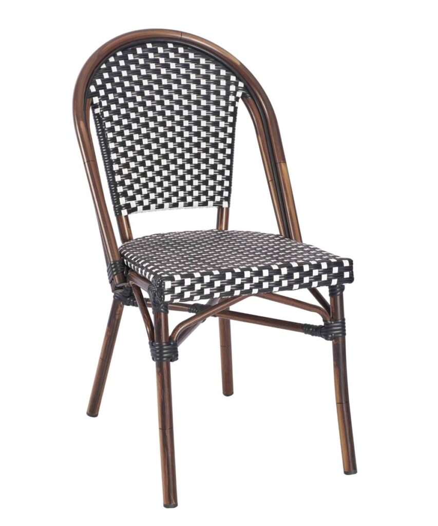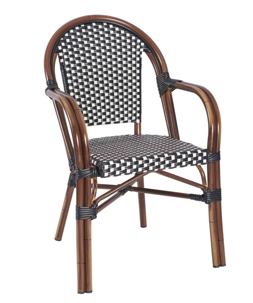 Carcassone stol och karmstol. Stomme i rottinglackad aluminium. Flätning i svart & vitt. Stapelbar 3st.