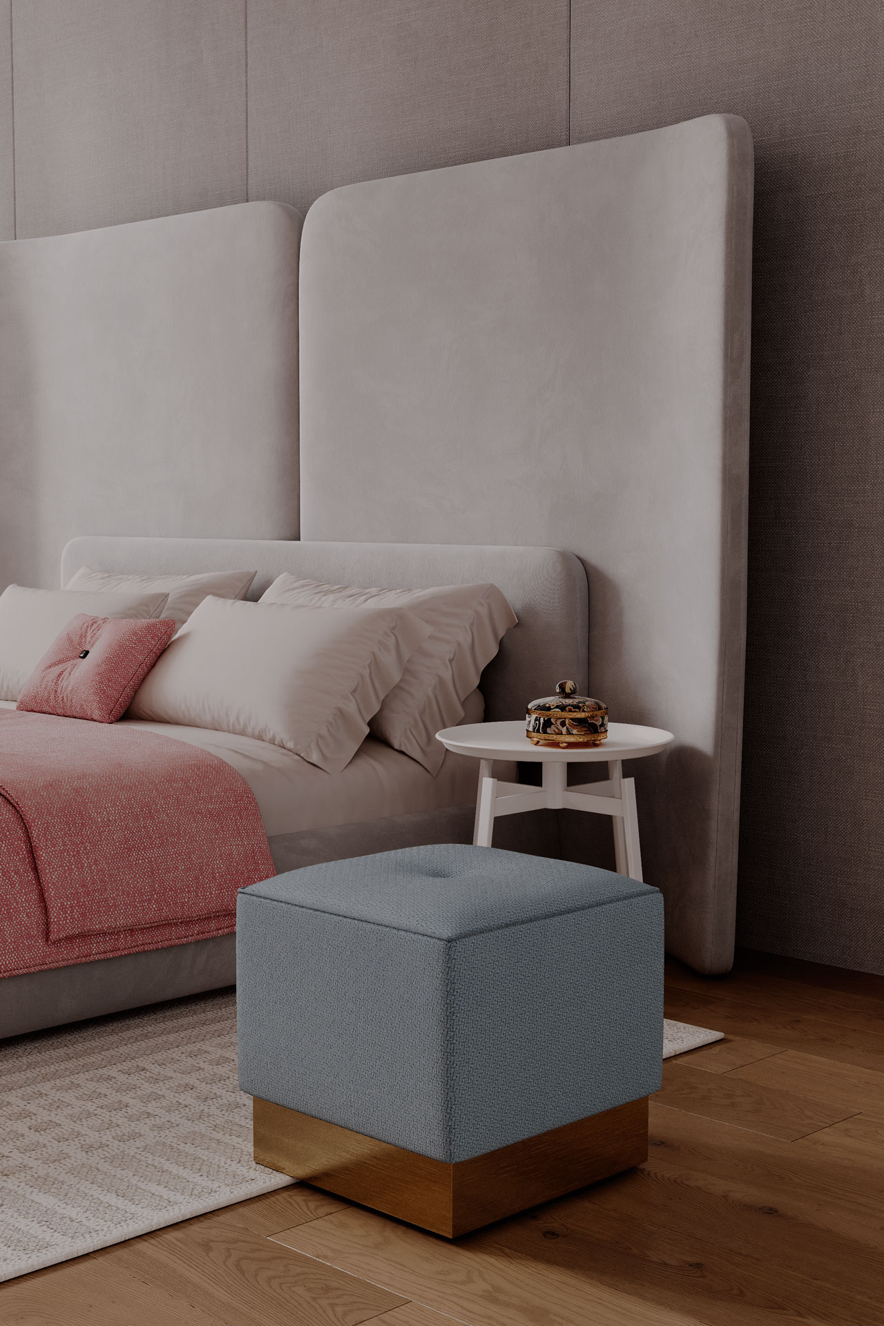 Puff 45x45cm, h.42cm, keder runt om och knapp på mitten. Laminerad träbas h.10cm i standard- eller metallic-laminat.