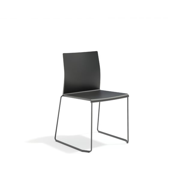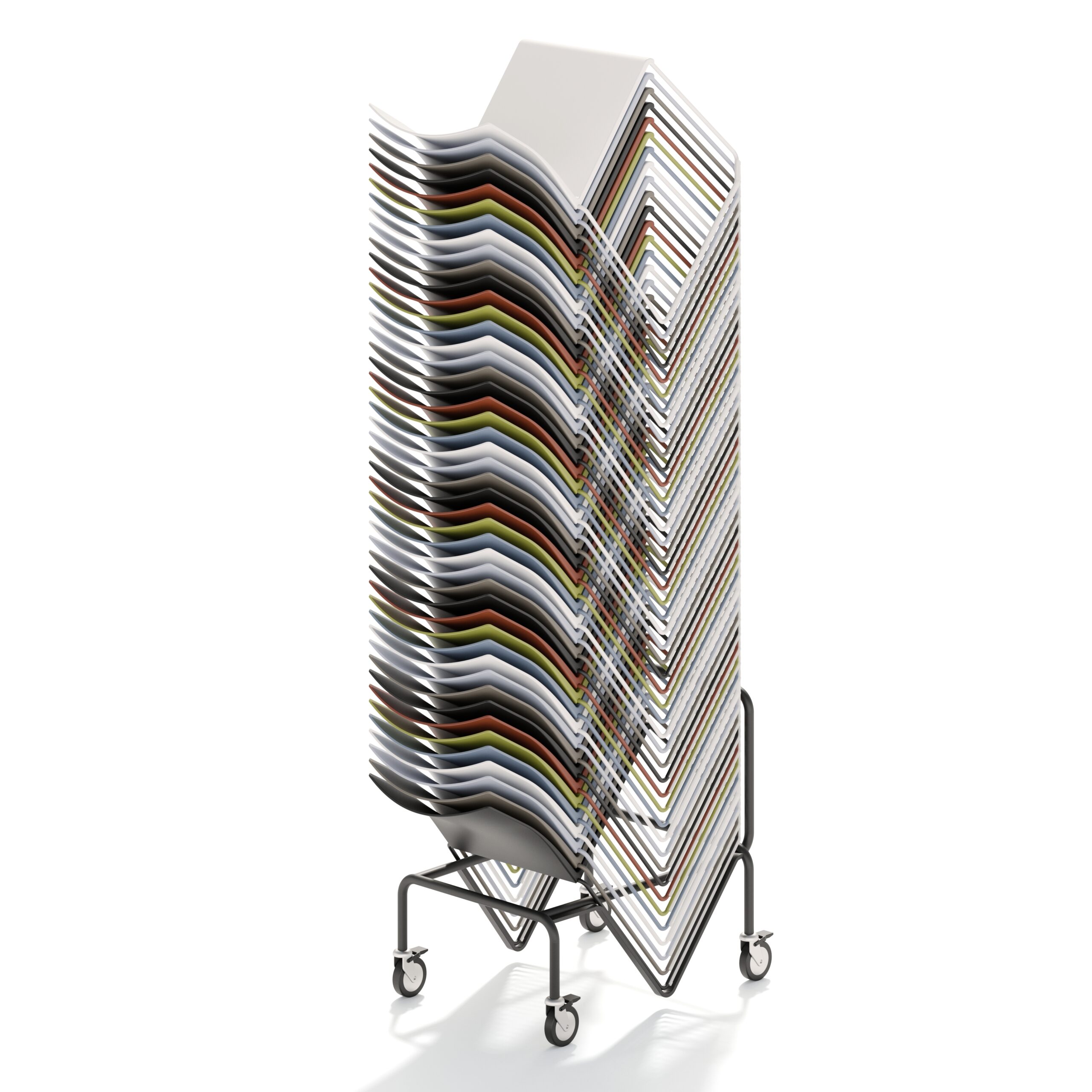 Stol på medar. Stapelbar 20st – på vagn 50st, med klädd sits 16 respektive 40st! 7 färgval på sittskal, ben i krom eller lackade..