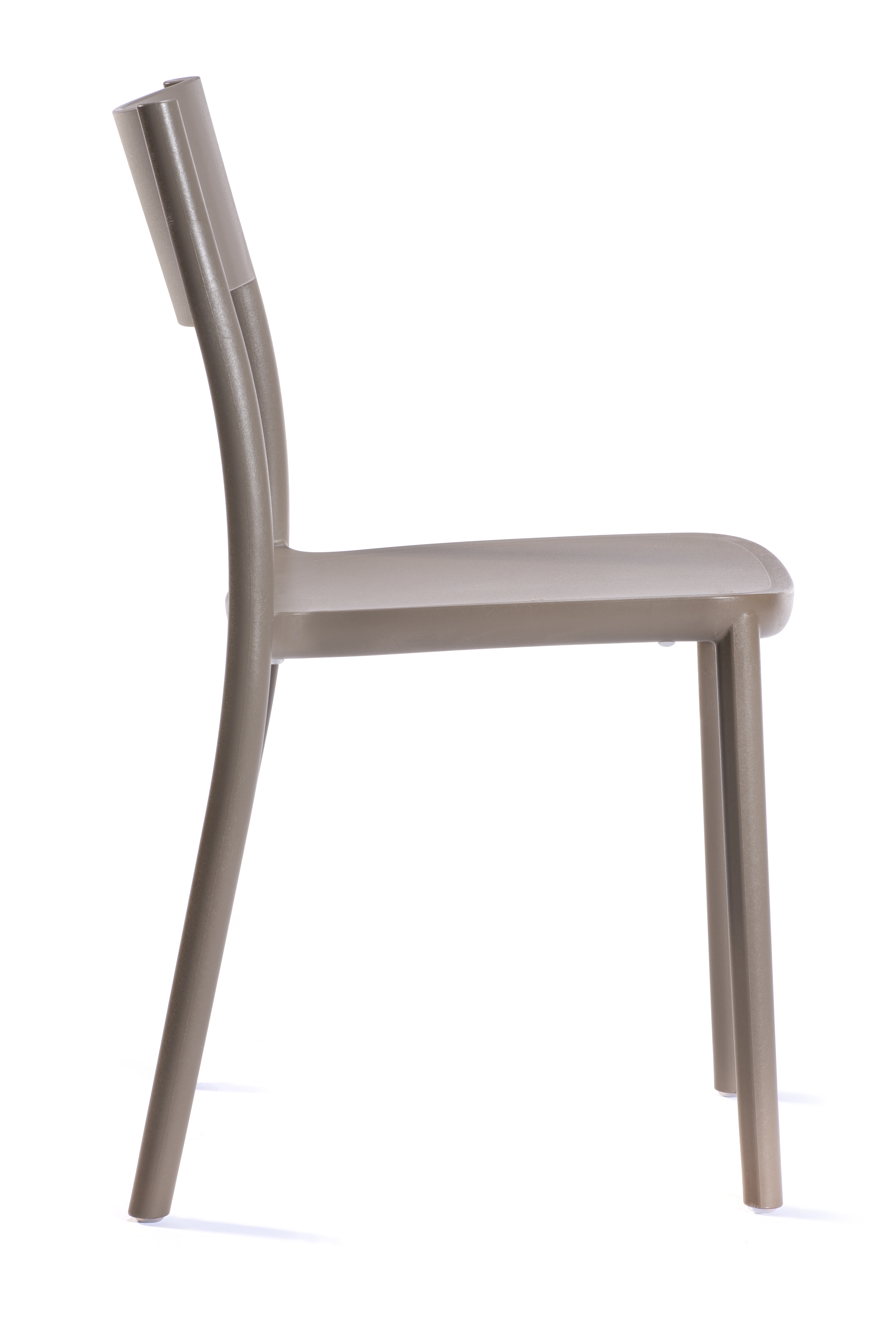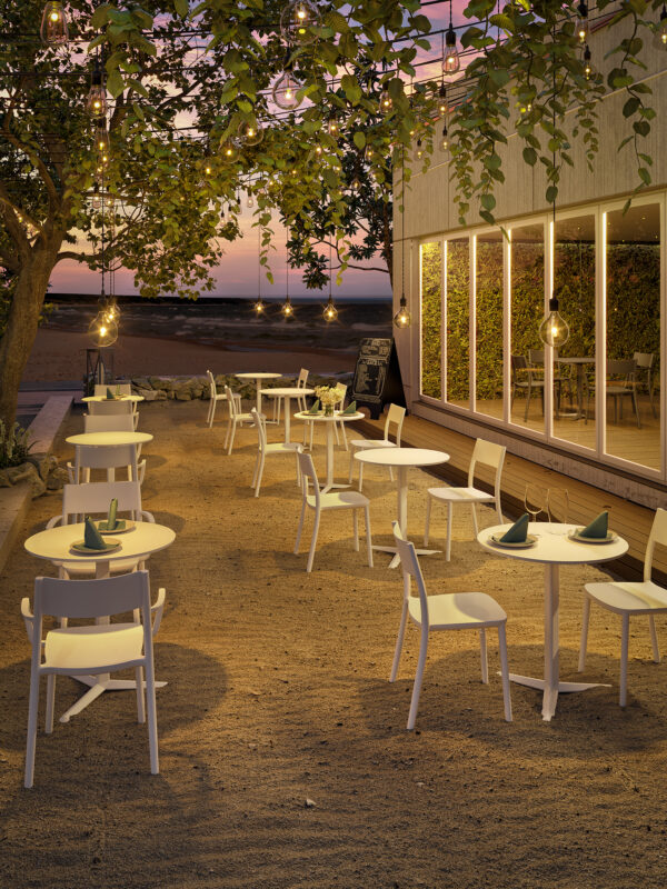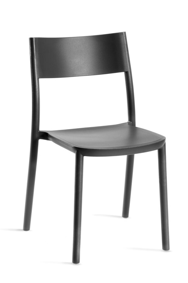Stapelbar stol, finns i flera färger, för inne- & utebruk. Tillverkas i tecnopolymer, varav tre färgställningar av 100% återvunnet material.