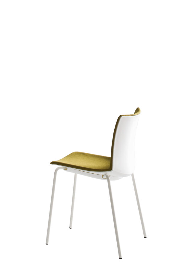 Stol på fyra stålben i krom, vitt eller svart. Sittskal i tecnopolimer med klädd insida.