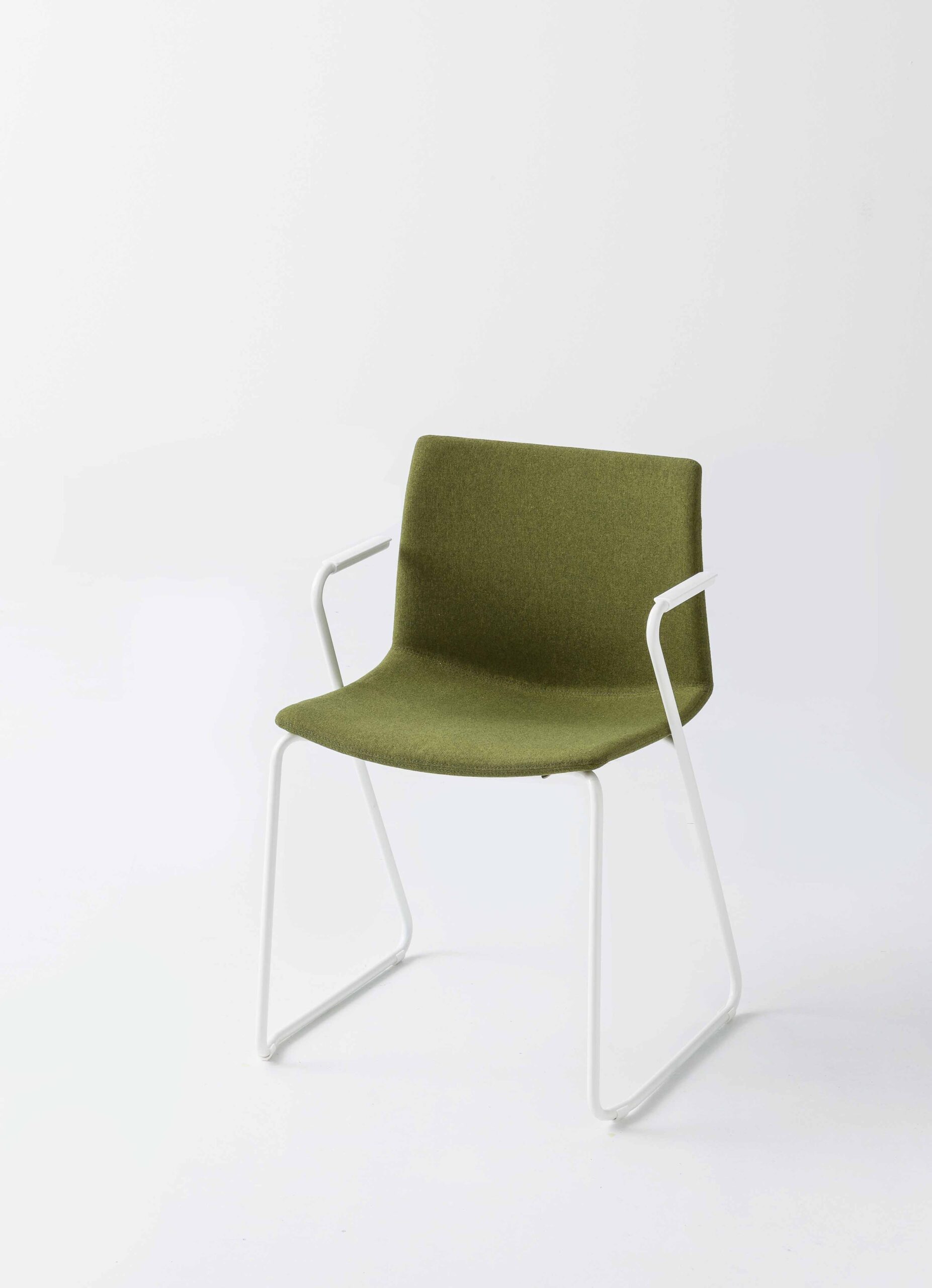 Karmstol på medar i krom eller vitt. Sittskal i tecnopolymer med klädd insida.