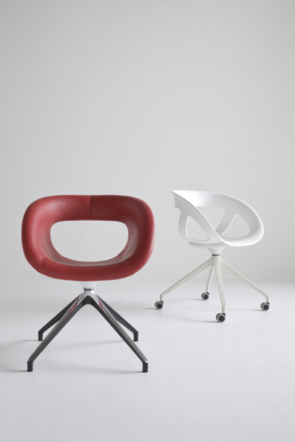 Karmstol på spindelben med snurr. Kläs i tyg, konstläder eller äkta skinn.