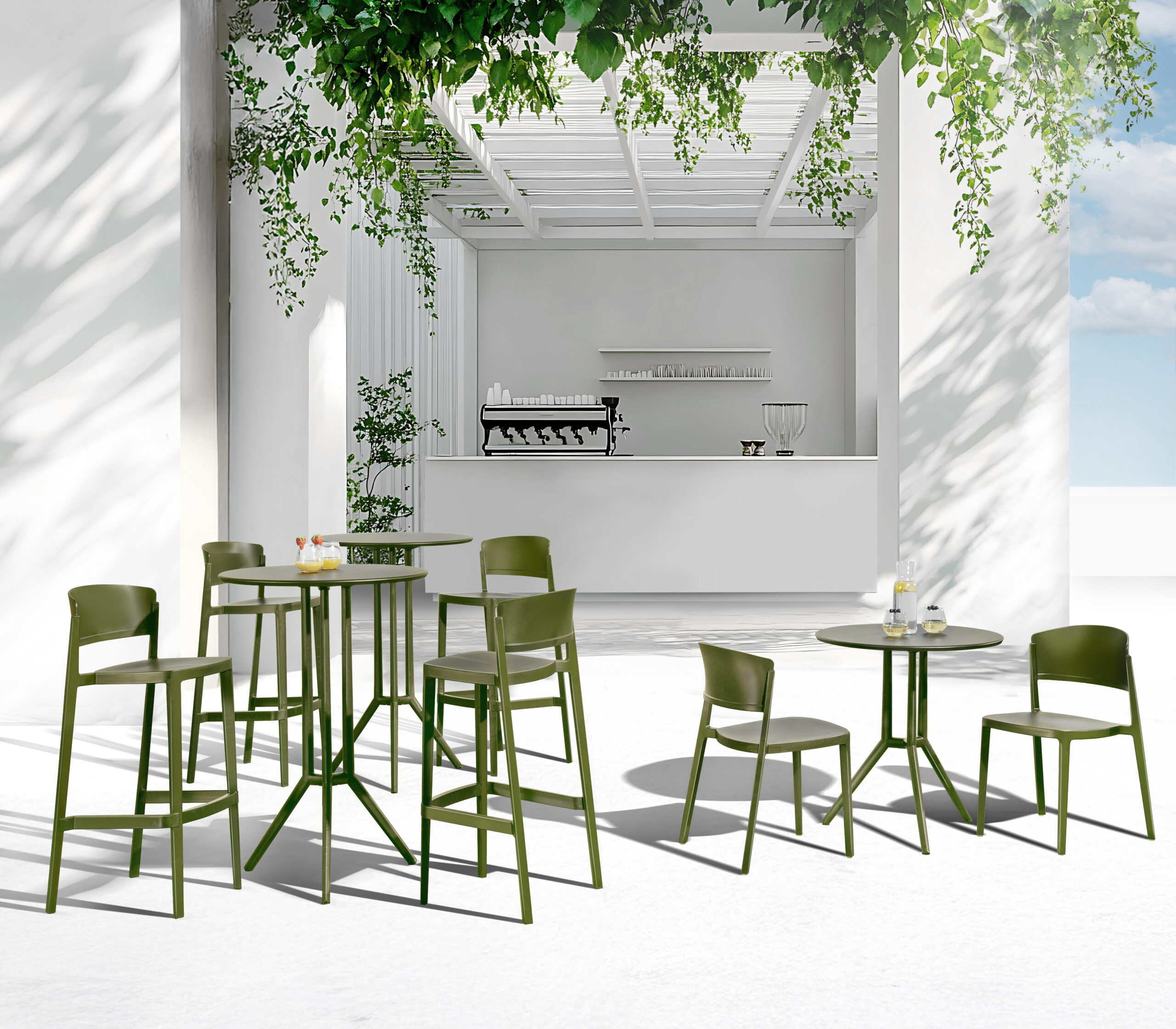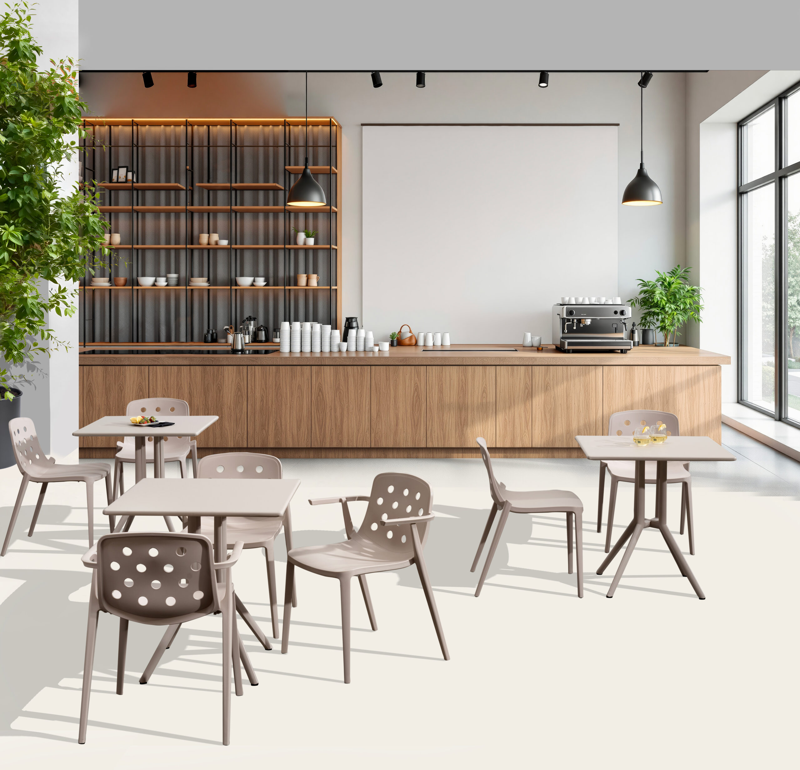 JUNIPER bord. Bordsskiva i stål kombineras med ett stativ i tecnopolymer. 4 ben med justerbara fötter. Standardhöjd 75 eller 105cm inklusive skiva.
