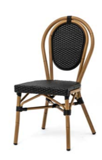 Marseille stol och karmstol. Stomme i rottinglackad aluminium. Flätning helt i svart. Stapelbar 3st.