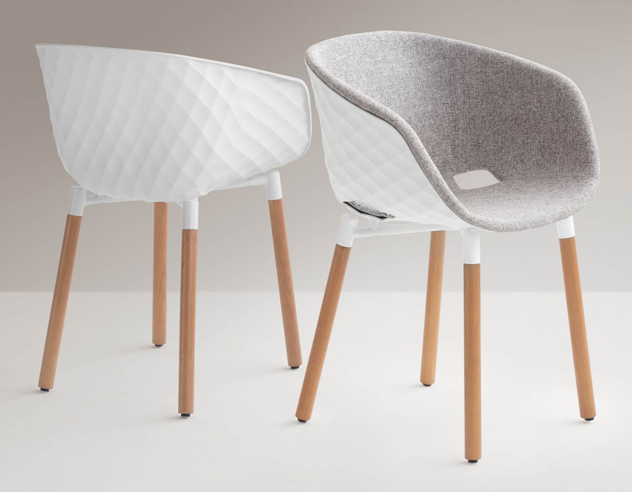 Karmstol UNI-KA, runda träben med metallinfästning, sittskal med klädd insida.