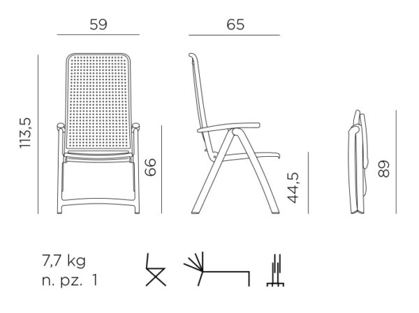 Positionsstol i 3 färger. Hopvikbar & ställbar i fyra lägen. Tillval dyna.