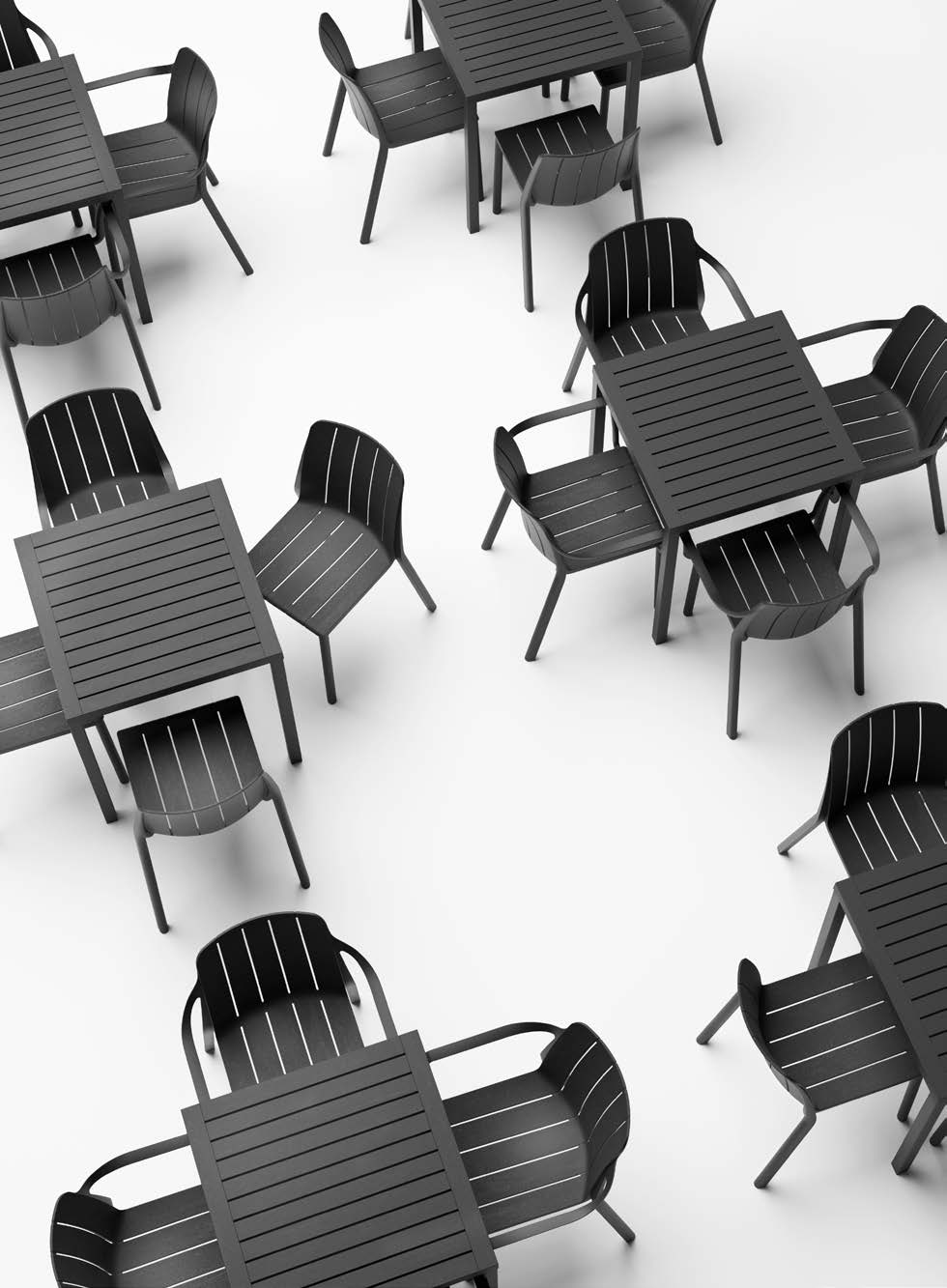 Bord 80*80cm, h.75,5cm. Stapelbart. Fyra färger.