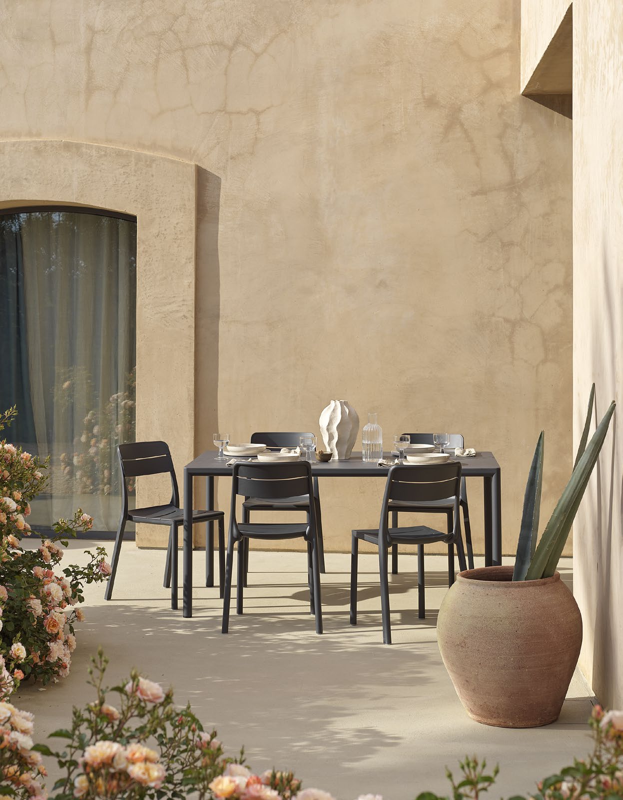 Fyra färgställningar. Bordsskiva i kompaktlaminat 6mm med färgmatchade ben i aluminium. Ställfötter.