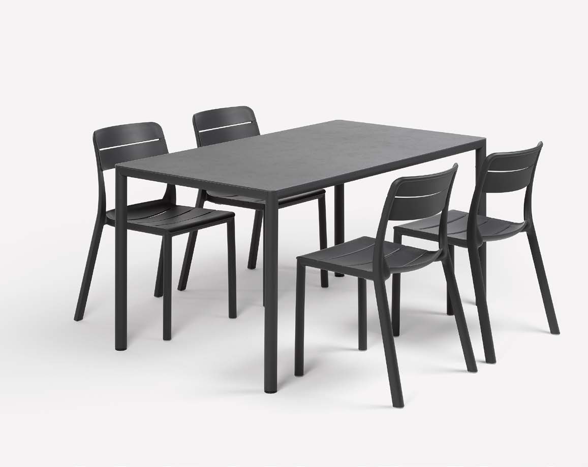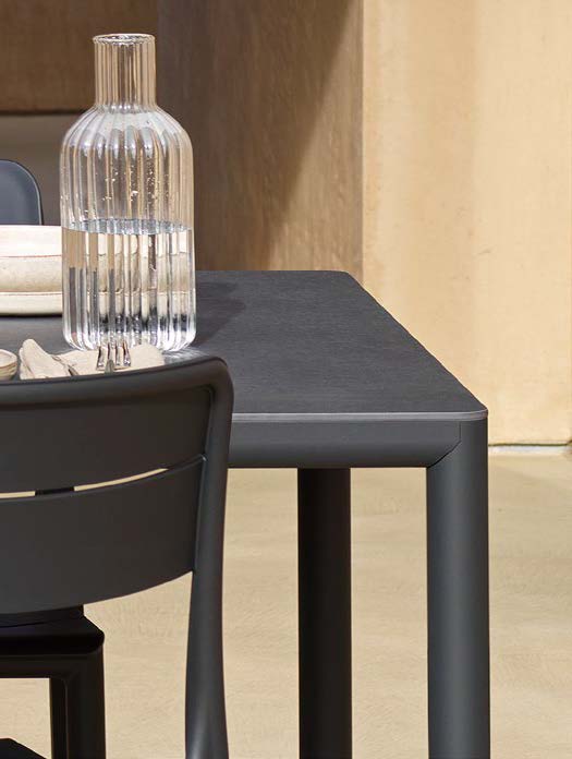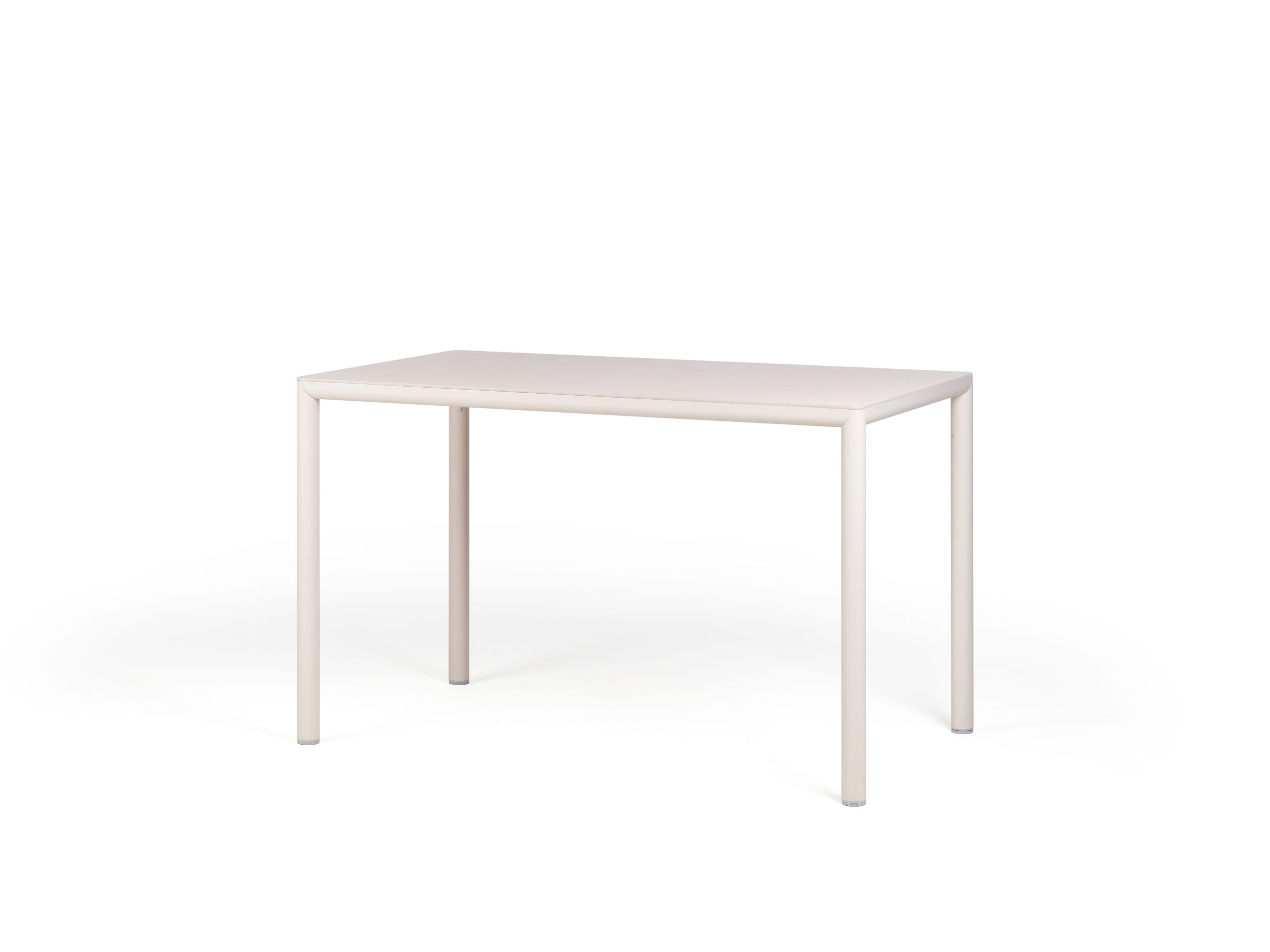 Fyra färgställningar. Bordsskiva i kompaktlaminat 6mm med färgmatchade ben i aluminium. Ställfötter.