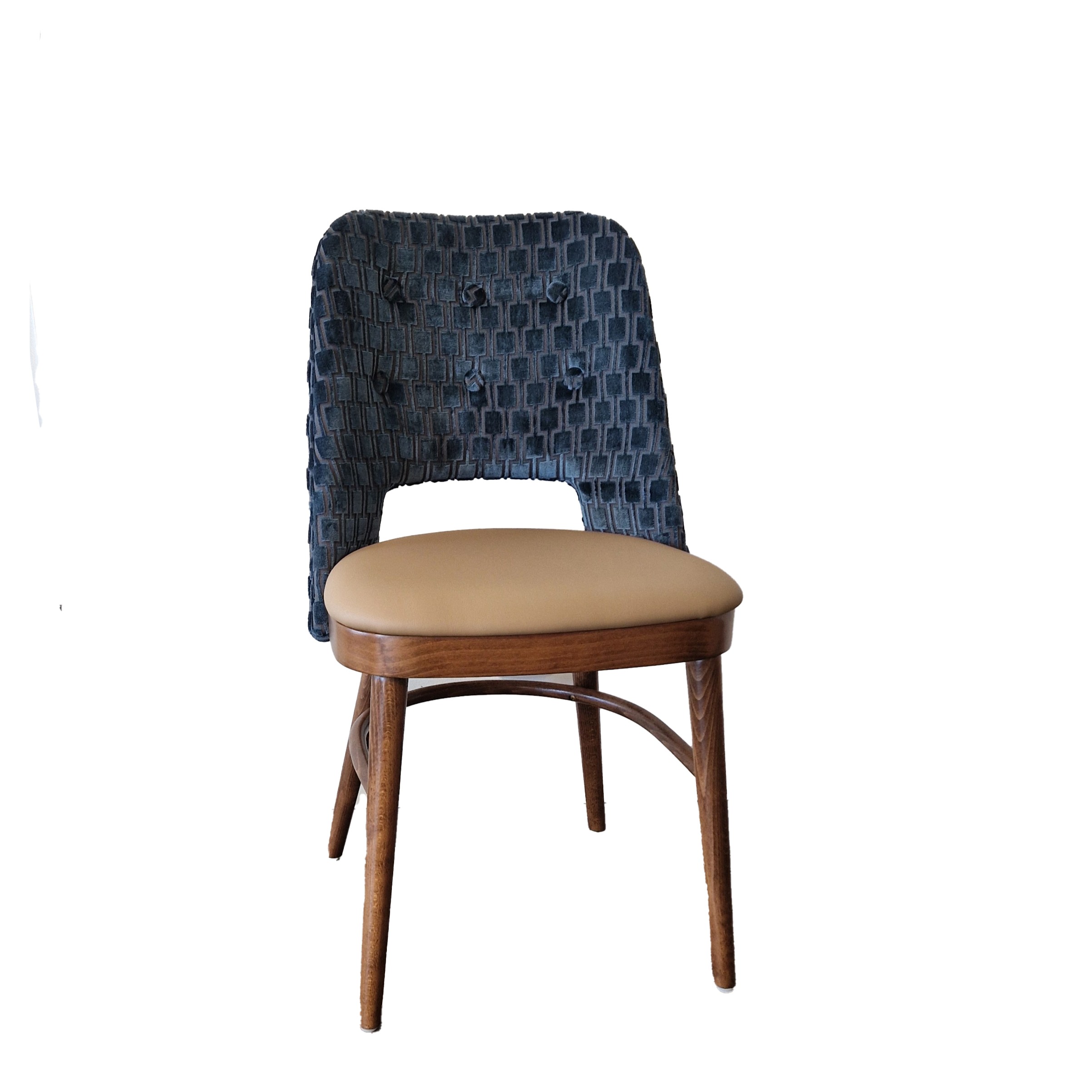 Stol SHELL med klädd rygg (både insida och utsida) och med klädd tunn sits – med eller utan knappar i rygg. Stomme i bok (natur/bets/lack).