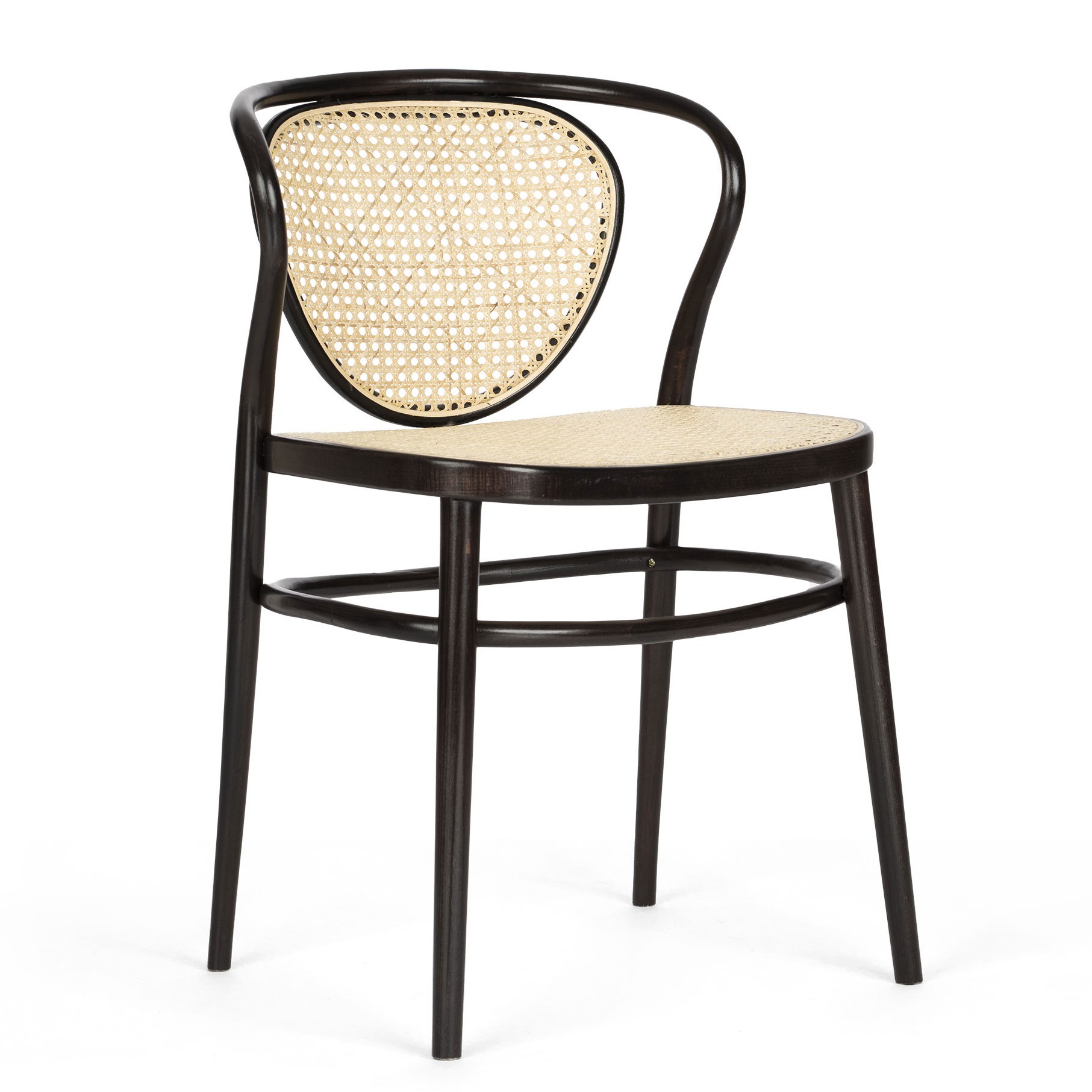 Modern böjträstol med rygg och sits i rotting (ready mat). Sitsen förstärkt med transparent väv. Bets M51 Brown. Filtglid.