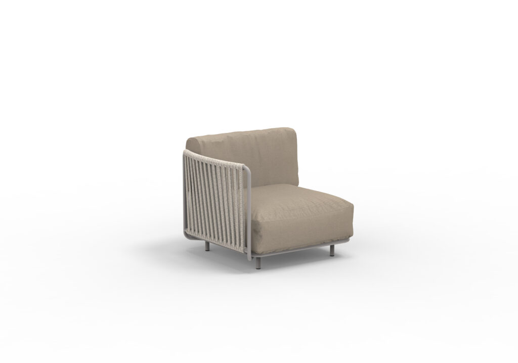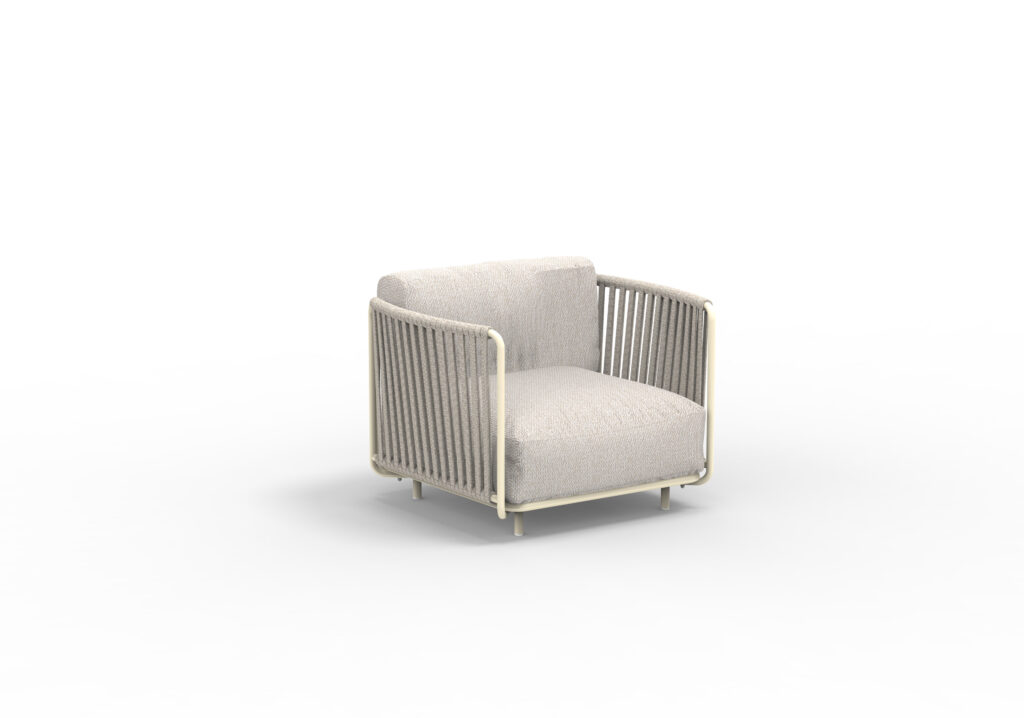 Loungefåtölj med vädertålig flätning & klädd i vattentätt tyg i flera varianter. Priset är inklusive sitt- & ryggdyna.