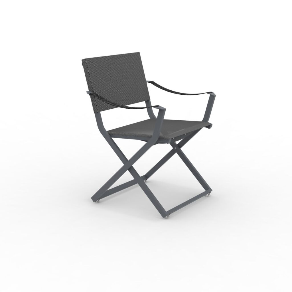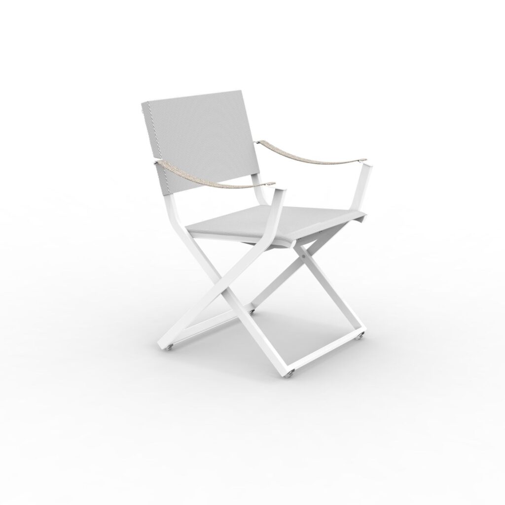Fällbar regissörsstol, stomme i lackad aluminium. Klädd Texplast Batyline Eden och armstöd i rep.