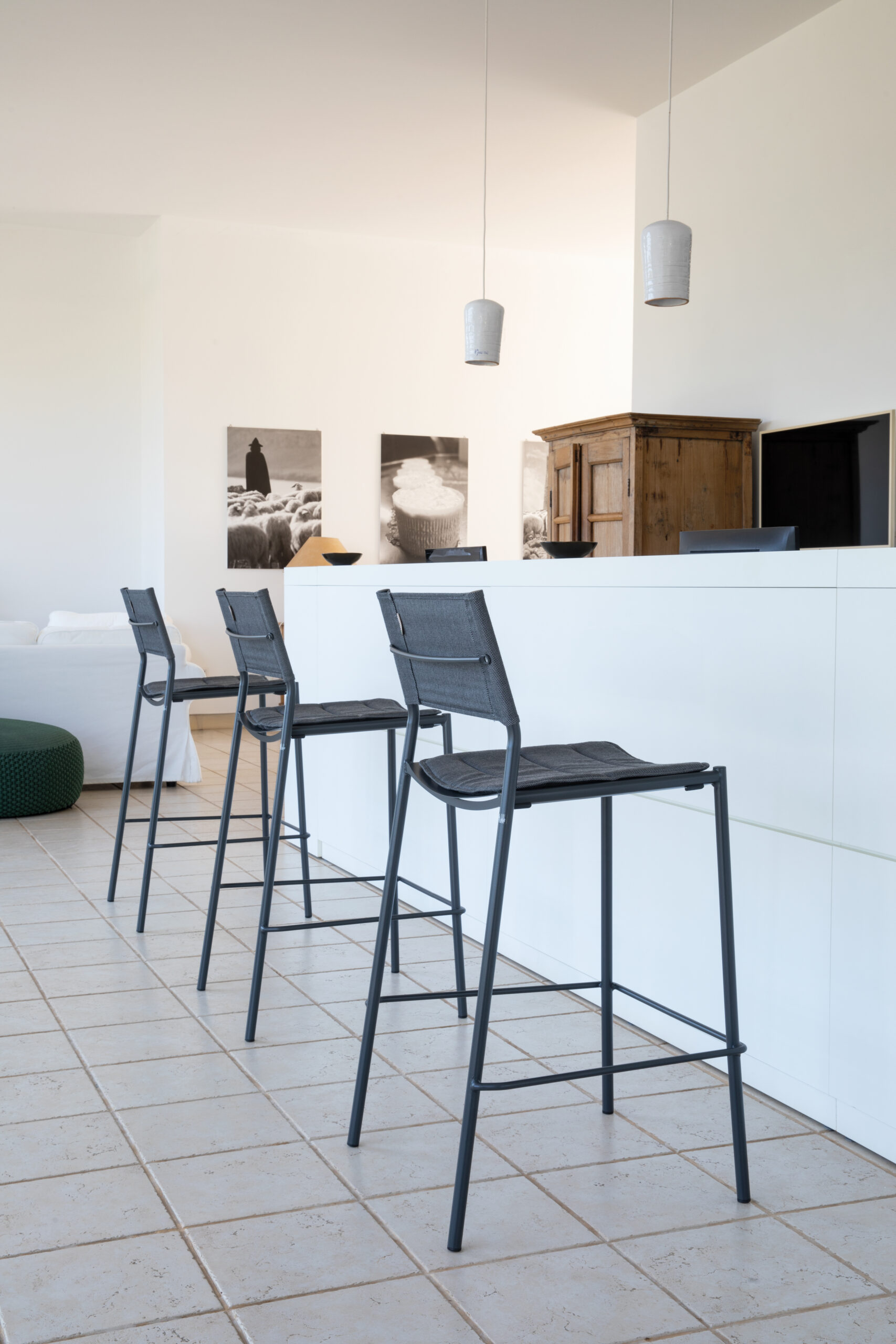 Barstol VERA i galvaniserat och lackat stål med rygg i Batyline (Texplast), sitthöjd 71cm. Stapelbar 6st. Tillval: Sittdyna klädd i Batyline.