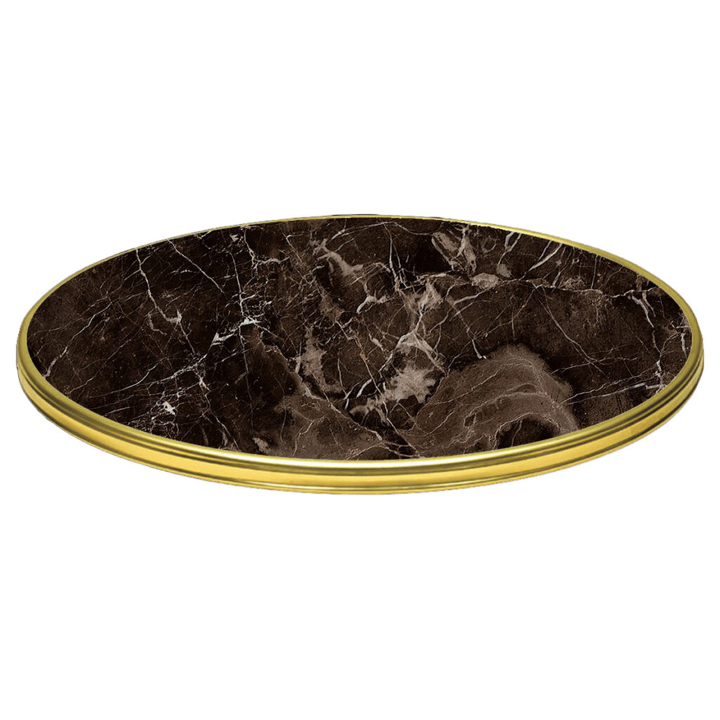 Runda bordsskivor med metallkant i äkta mässing eller i rostfritt stål.